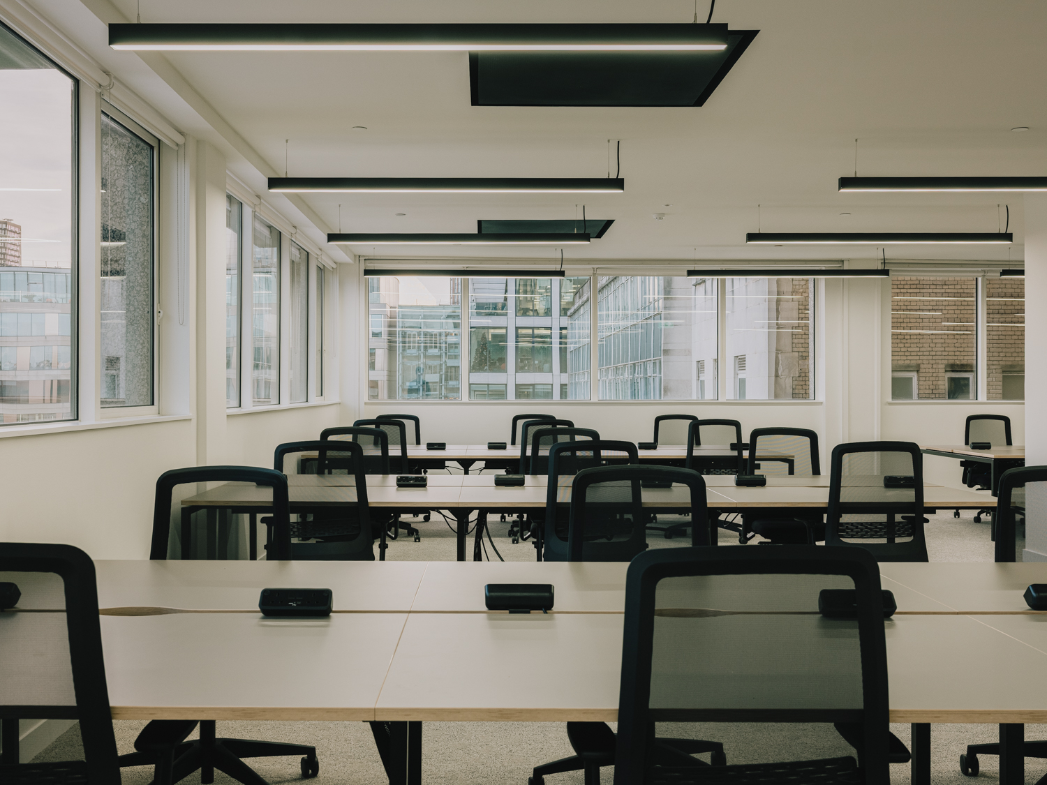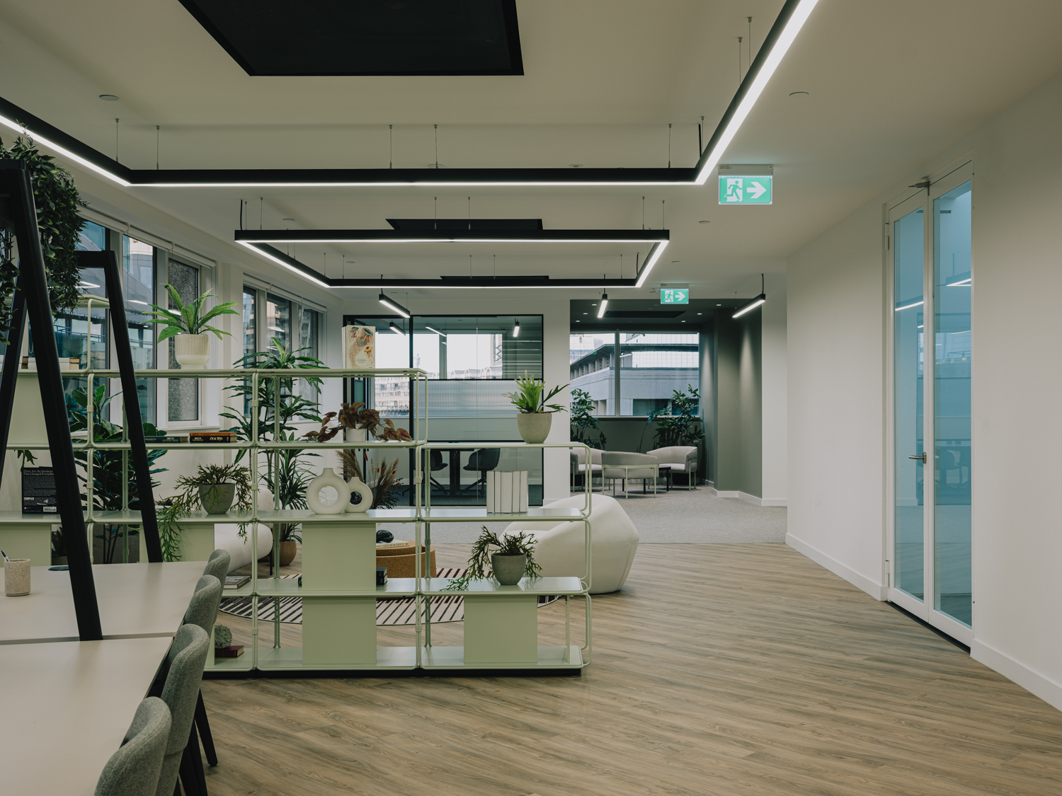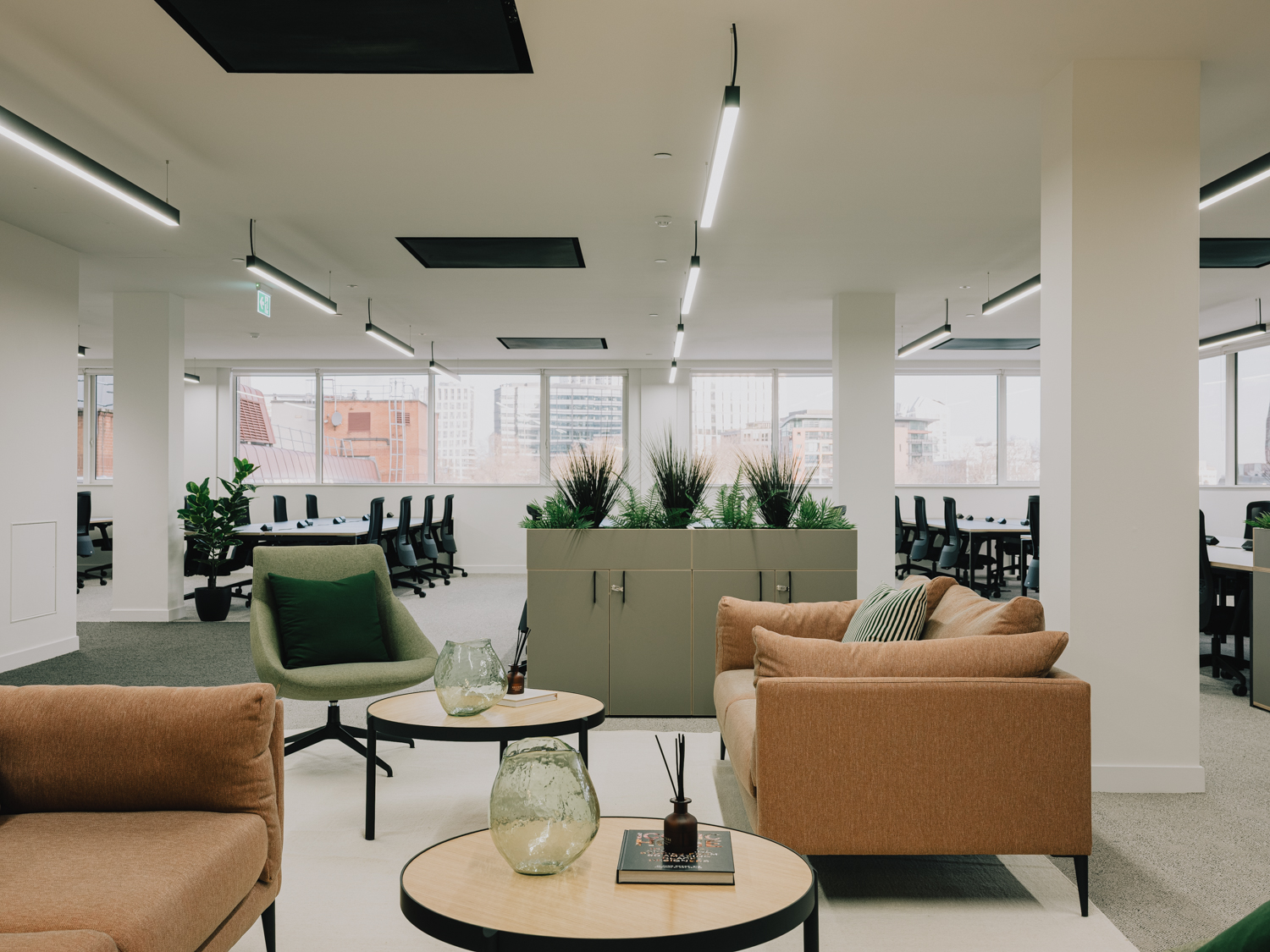 A premium office refurbishment in the heart of the City of London, Chiswell Street combines contemporary workspace design with exceptional tenant amenities. The project includes full modernisation of office floors featuring new LED lighting and high-performance ARTUS fan coil units, all within an exposed services aesthetic that enhances the building’s character. A key element of the works involved the careful relocation and reconfiguration of existing rooftop plant, including Tesco’s chillers and associated electrical infrastructure, to create space for new amenity areas while maintaining full operational continuity for the building’s tenants. At its centrepiece is a new Business Lounge, designed as a comfortable and flexible space for tenants to meet, relax, and collaborate. The crown jewel of the refurbishment is the stunning new roof terrace, offering panoramic views over the Honourable Artillery Company’s historic green grounds—one of the most impressive vistas in London.