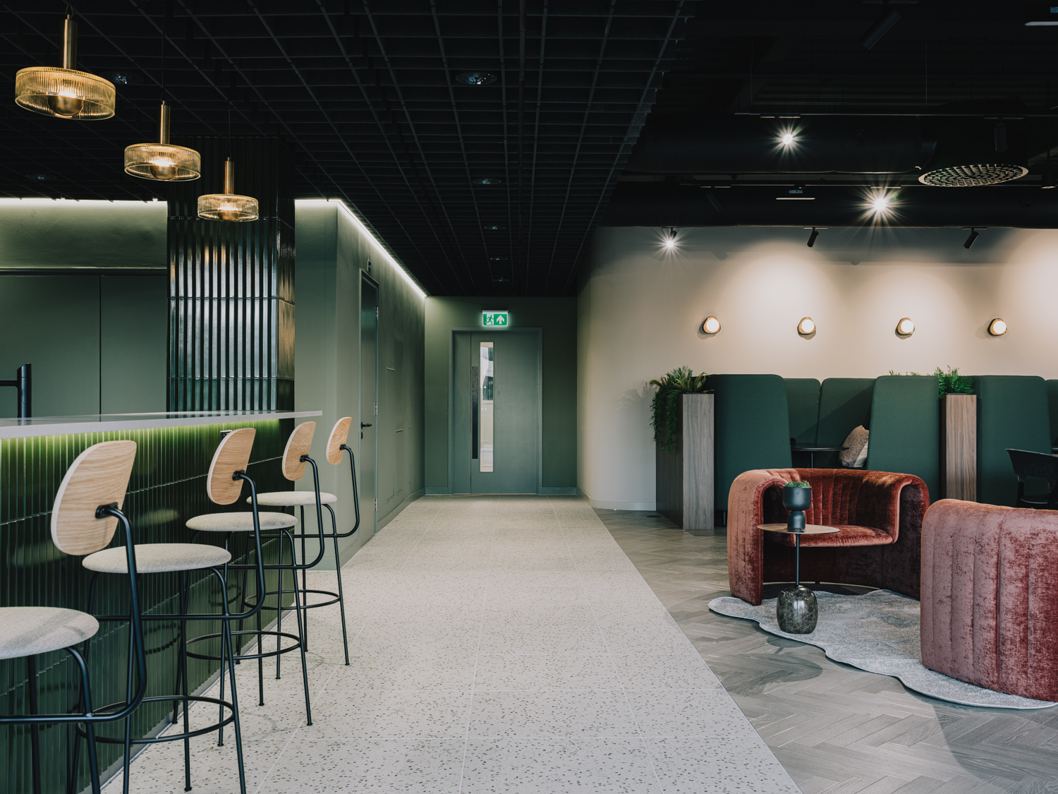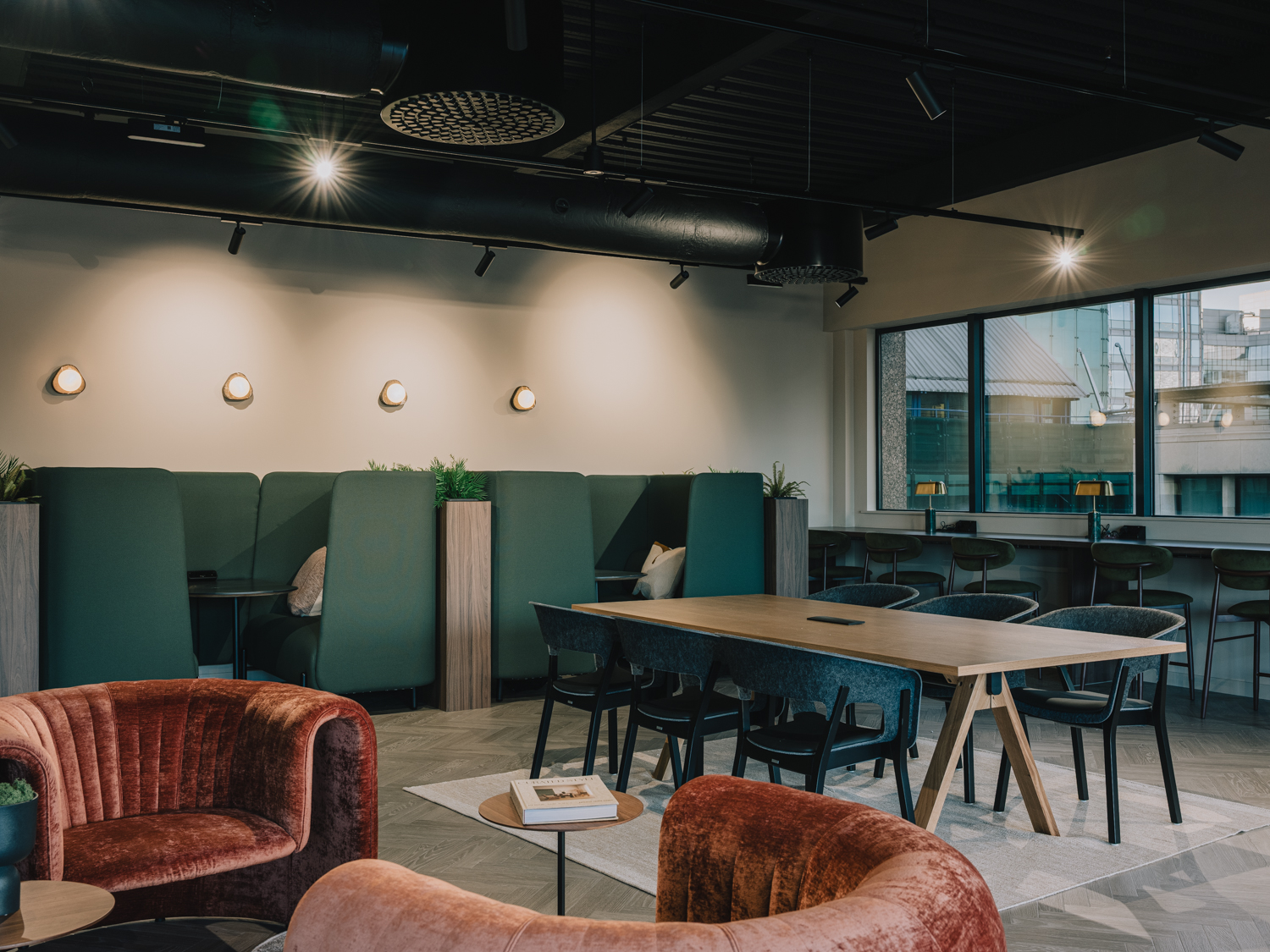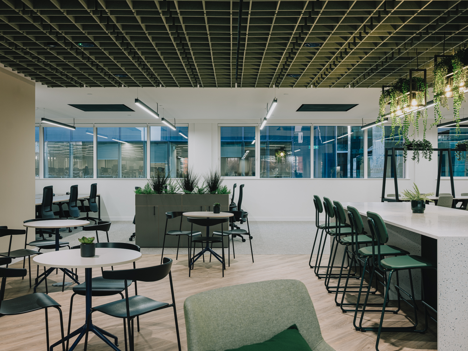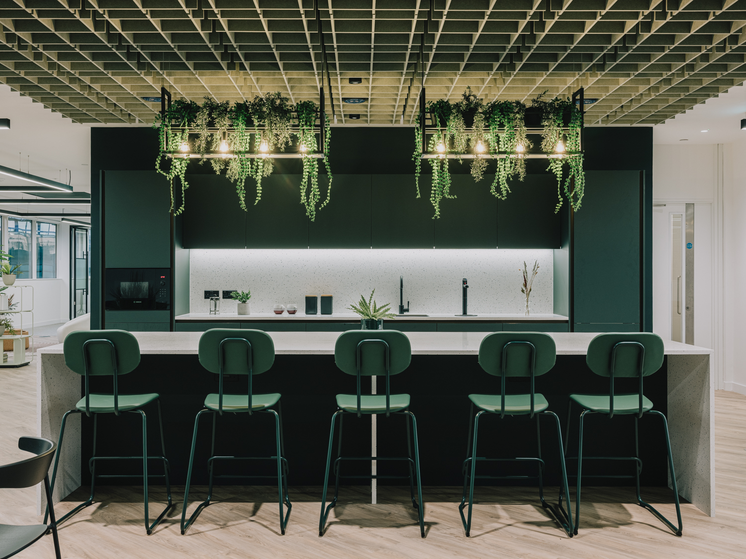 A premium office refurbishment in the heart of the City of London, Chiswell Street combines contemporary workspace design with exceptional tenant amenities. The project includes full modernisation of office floors featuring new LED lighting and high-performance ARTUS fan coil units, all within an exposed services aesthetic that enhances the building’s character. A key element of the works involved the careful relocation and reconfiguration of existing rooftop plant, including Tesco’s chillers and associated electrical infrastructure, to create space for new amenity areas while maintaining full operational continuity for the building’s tenants. At its centrepiece is a new Business Lounge, designed as a comfortable and flexible space for tenants to meet, relax, and collaborate. The crown jewel of the refurbishment is the stunning new roof terrace, offering panoramic views over the Honourable Artillery Company’s historic green grounds—one of the most impressive vistas in London.